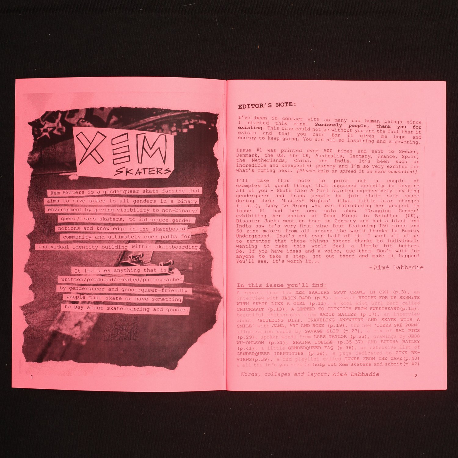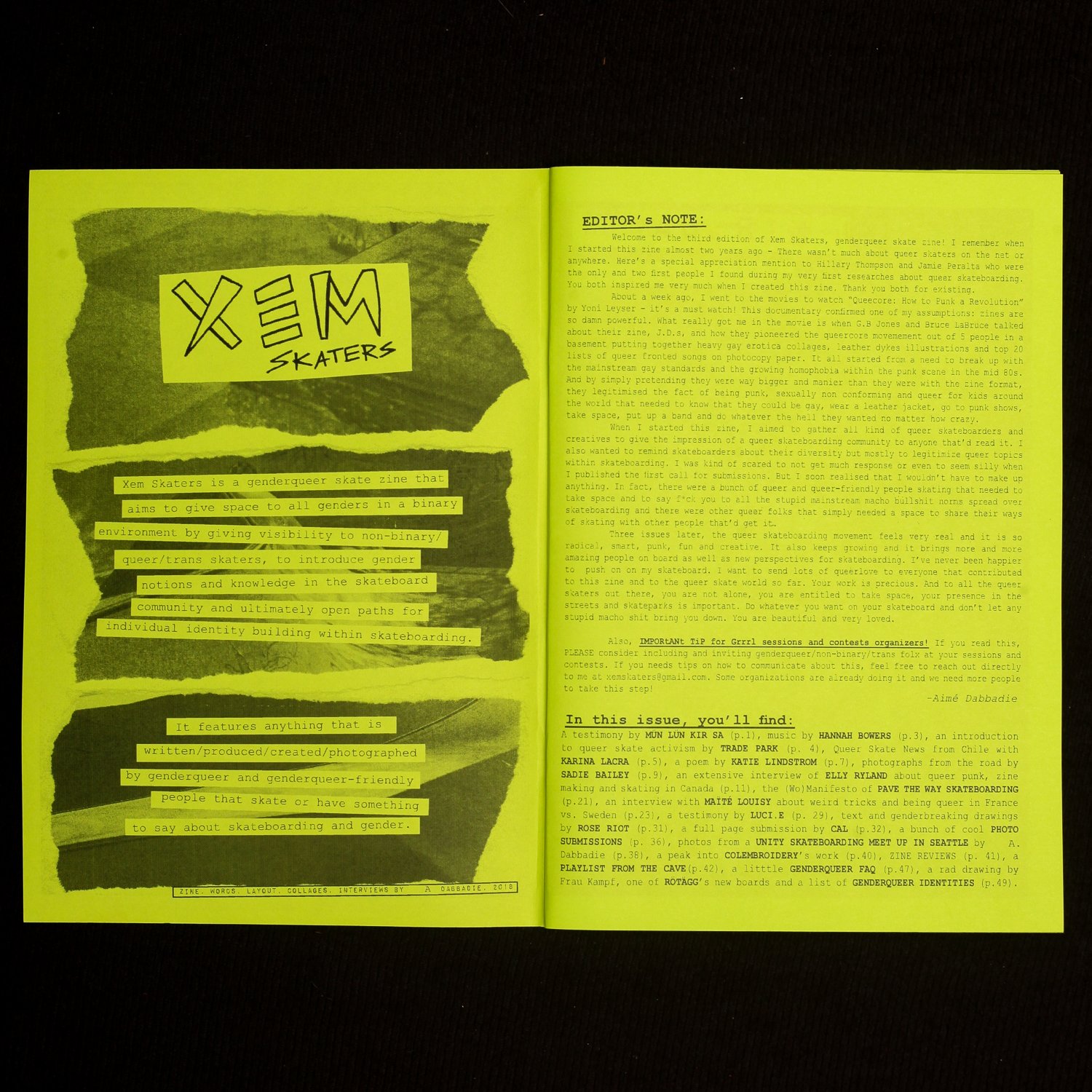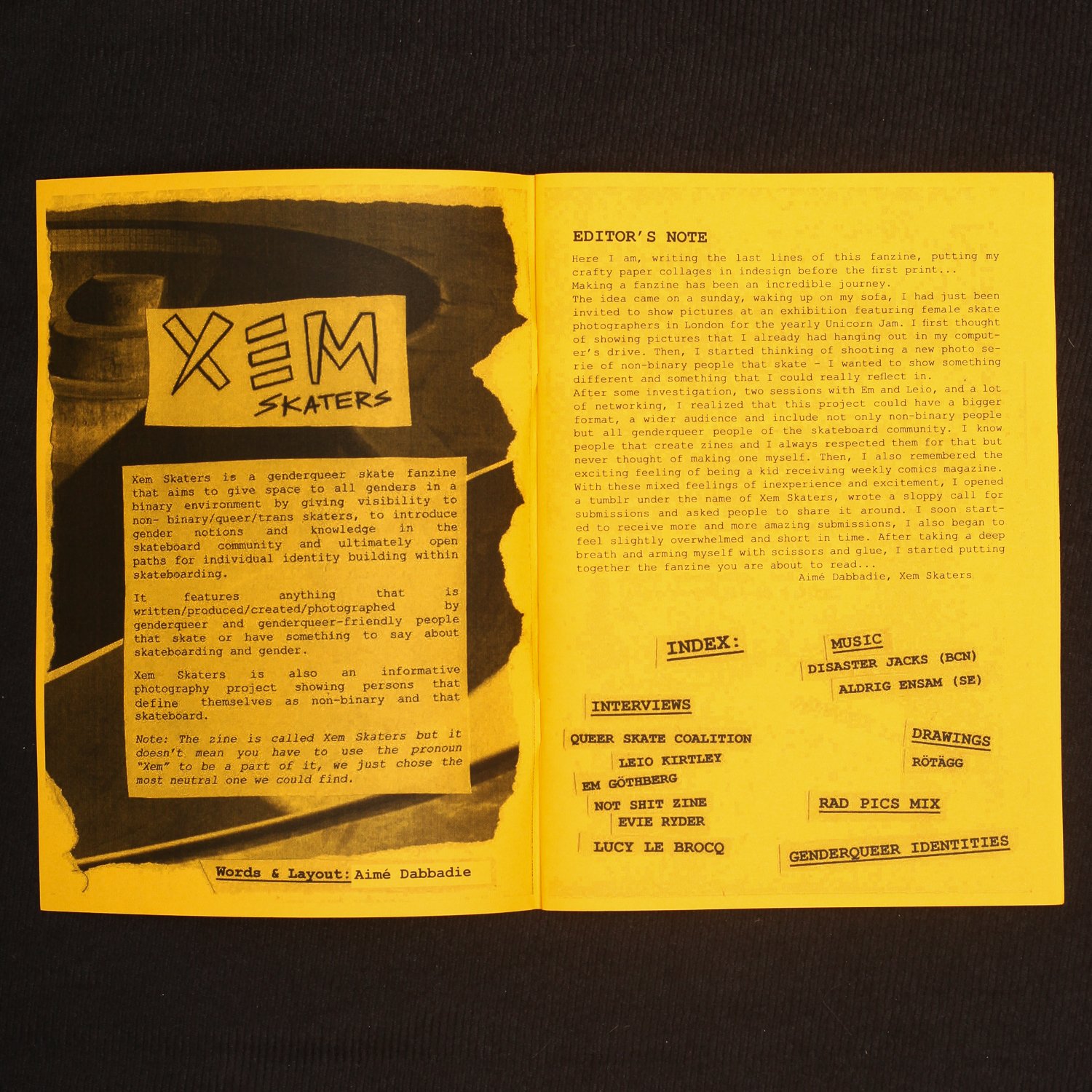 Xem Skaters is a community queer skate zine founded by Aimé Dabbadie in June 2016. It was created with the aim to start the conversation about homophobia, transphobia and genderqueer visibility in the skateboarding scene.