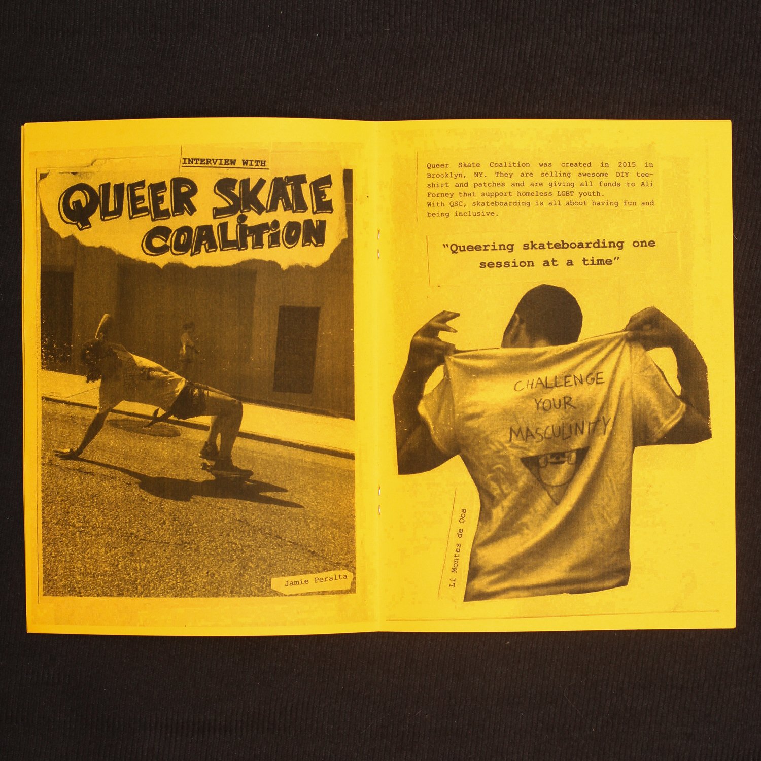 The zine is constructed on the community editorial basis. Aimé published “Call for Submissions” inviting all genderqueer and genderqueer-friendly skaters to submit all kind of content that could fit in the zine format for each issue. Submissions were sent from various places in the world including Chile, France, Australia, U.S.A, the U.K, Spain, Germany, Denmark, Sweden and many more. Aimé handled the editorial process, ran interviews with selected skateboarders and artists for each issue and created playlists of queer-fronted music as well as queer zines and books recommendations. The submissions took the form of poetry, testimonies, photographs, drawings, artworks, music lyrics, band presentations and more. The zine was also meant as a tool for queer skaters to connect and avoid feeling isolated and an easy format to bring to local skateparks to raise awareness about queer and trans inclusivity.